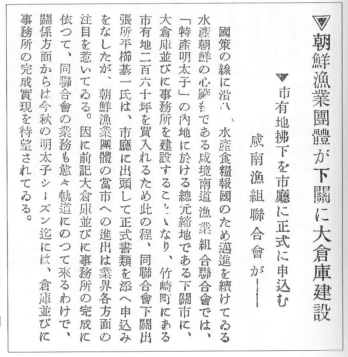 明太子倉庫建設計画のため咸鏡漁組が下関市に正式に申込む