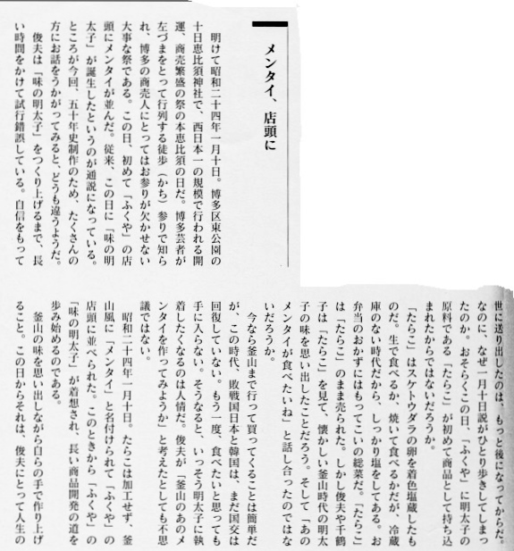 自社編集の社史で、昭和24年1月10日にメンタイと名付けて、北海道のたらこを加工せず売ったと記述しているのは、貴重な資料です。 他方、北海道のたらこを加工せず「メンタイ」と売っていたことから、今でいう明太子を作った時期の特定には、客観的な資料が必要となってくきます。