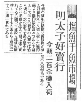 大正3年12月12日の関門日日新聞に「明太子」の文字が初めて確認されました。 新聞というメディアの性質上、この時点で既に日本で周知の事実の言葉であったことがわかります。 このことから考えると、他の地域の新聞も含め、この先まだまだ古い日付の発見があるかもしれません。