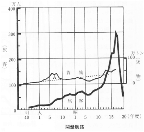 この関釜航路の開設から昭和初期までの輸送実績を示します。